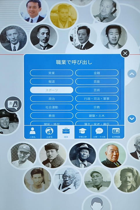 それでは具体的な手順によって疑似的に体験してみよう。例えば「職業」のタブには「実業」、「報道」、「芸能」、「政治」、「宗教」などさまざまなボタンが用意されている。このうち「スポーツ」のボタンを押してみる(便宜上「職業」に組み込まれているが、スポーツ界という程度の意味)。