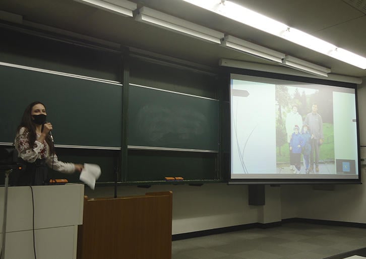 1月12日、三田キャンパスにて、ウクライナ人元留学生カテリーナ・ノヴィツカさんによるスピーチが行われた。カテリーナさんは、キーウ大学で日本語を学んだ後、2017年秋から1年間、慶應義塾大学に留学した。現在はNHKで番組制作ディレクターを務めている。