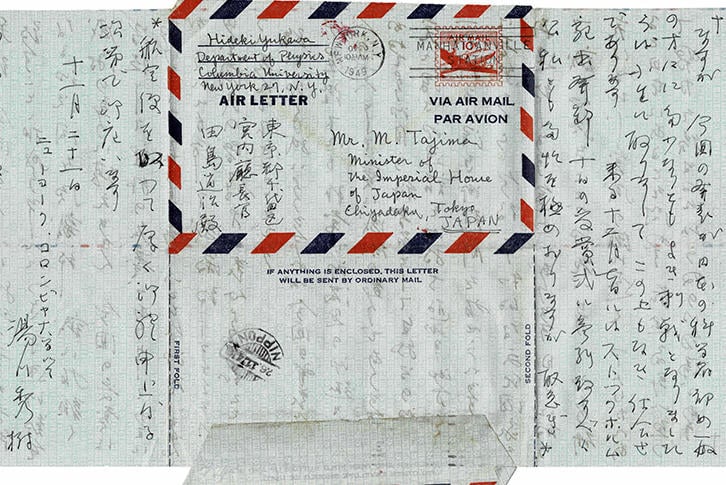 拝復 今回小生ノーベル物理学賞を受領致すことと相成りましたにつき早速御鄭重なる御祝詞を頂戴致し誠に有難く感謝の至りに堪えません 今回の受賞は學徒として望外の名譽でありまして小生に取りましてこれ以上嬉しいことは御座いませんが それにも増して感激いたしますことは日本国民の皆様方が衷心よりわがことのように嬉んで下さることです