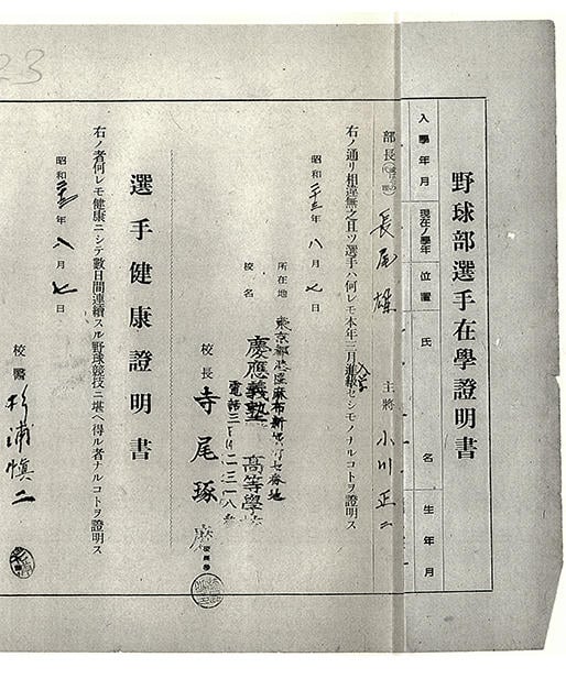 慶應が明治高校(現・明大明治)を破って、甲子園出場を決めた時、明治高校から抗議が出された。すなわち、「慶應義塾第一高等学校、第二高等学校というのはあるが、慶應義塾高等学校という名称のものは、文部省には登録されていない。したがって、そういう偽りの校名における優勝は無効である」というものである(『二十年』64頁)。