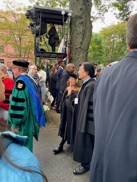 こうした手腕が評価され、1636年の創立以来、400年近い歴史を誇るハーバード大学において初めて、ウィルバー・A・カウェット記念政治学教授の冠を持つ黒人女性が新学長に指名された。かくして、本来なら伊藤公平塾長が出席すべきところ、スケジュールの関係上、米国東海岸に勤務する私が名代を務めた。招待された全世界180以上の大学及び学術組織の代表団のうち、日本からは他に東京大学を代表して理事・副学長の林香里教授と副学長の矢口祐人教授、東北大学からは副学長の山口昌弘教授が出席して記念行進に加わり、その模様はTV中継された。