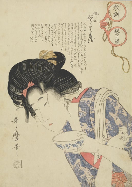 その矢先、蔦屋自身も没するが、歌麿は美人画制作への意欲を失わず、幕府が重んじた儒教的価値観に着目し、新たな作品群を発表していく。「教訓親の目鑑が俗ニ云ぐうたら兵衛(きょうくんおやのめがねがぞくにいうぐうたらべえ)」(図1)では、親の目線から娘の性格を戒める詞書とともに、これに反発するかのような娘たちの生き生きとした表情が描かれた作品である。また晩年には、儒教の親子愛に通じる、母と子の愛情を主題とした母子像に画業の集大成を見出した。しかしながら、禁じ手であった『太閤記』を題材にした作品を発表したことで処罰を受け、間もなくこの世を去った。