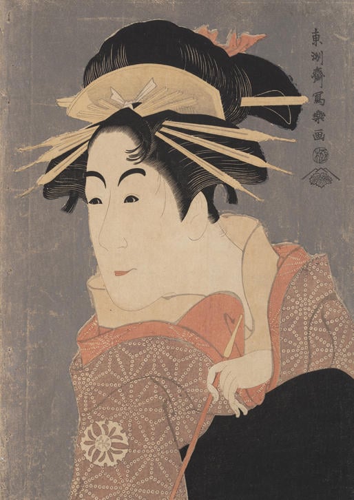 一方、歌麿が美人画で人気を博していた寛政6年、彗星のごとく登場したのが東洲斎写楽である。写楽を大々的に売り出した蔦屋は、歌麿の美人大首絵で確立した表現手法を写楽の役者絵に応用している。雲母の背景に歌舞伎役者の半身像を浮かび上がらせ、迫力ある作品に仕上げたのだ。たとえば「松本米三郎のけわひ坂の少将実少は松下造酒之進妹しのぶ(まつもとよねさぶろうのけわいざかのしょうじょうじつはまつしたみきのしんいもうとむすめしのぶ)」(図2)では、女形役者の大きな鼻やつぶらな瞳、そして乱れた髪の毛を忖度せずに描き出している。写楽の斬新な浮世絵は話題となるが、その誇張した描写は徐々に飽きられてしまい、わずか10か月で姿を消す。