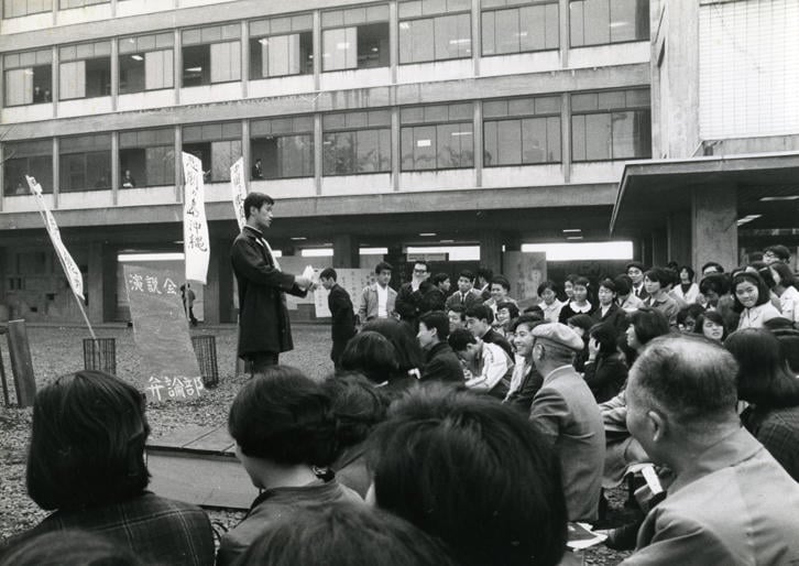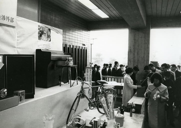 毎年11月に開催される三田祭は、古くは1951(昭和26)年からのいわゆる文連祭に始まります。学術研究団体連盟と文化団体連盟が合同で開催したもので、1953年には三田祭と称されましたが、慶應義塾創立100年を迎えた1958年には一貫教育校も含めた全塾的な「100年祭」としてキャンパスを越えて実施されました。現在の三田祭は慶應義塾の第2世紀を迎えるその翌年を第1回とし、三田キャンパスで秋に開催することが定番となっています。写真は第8回の1966(昭和41)年の三田祭です。当時の「三田新聞」などを見ると年々マンネリ化が話題にのぼり、10周年に向けて果敢に企画が練られました。「なぜ企画するのか、その中から何を得るのか」が各企画案に問われ、本部企画は「転換期に立つ日本の選択」とされ、講演やシンポジウムが開催されました。当時の経済企画庁長官の藤山愛一郎氏による講演「明日の日本」は大教室が満員となりました。弁論部は屋外演説会を試み、そのテーマは週刊誌記事から火がついた「女子大生亡国論」や「女性と職業」、あるいは返還運動が盛んだった沖縄をテーマに「悲劇の島、沖縄」、また「政治の腐敗」などが選ばれ、幟が立てられて聴衆を集めています。他方で福引も復活し、南校舎1階の教務部にそって一口100円の福引を求めて長蛇の列ができました。