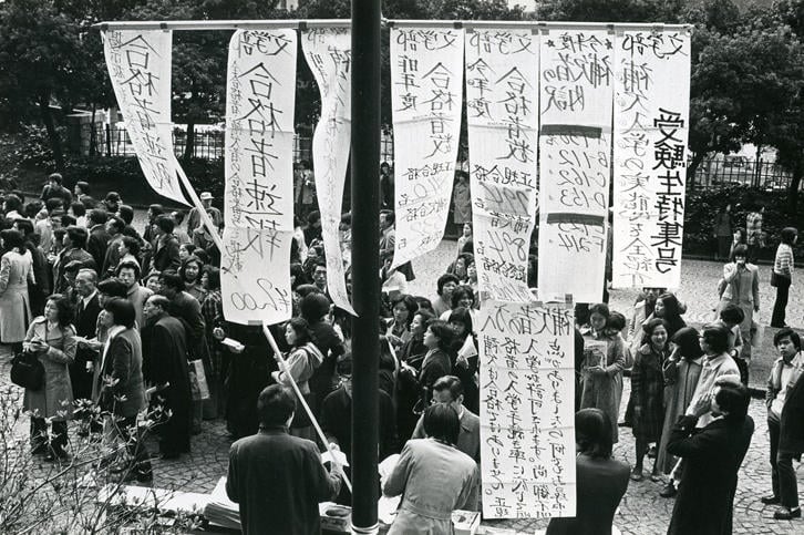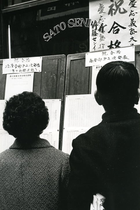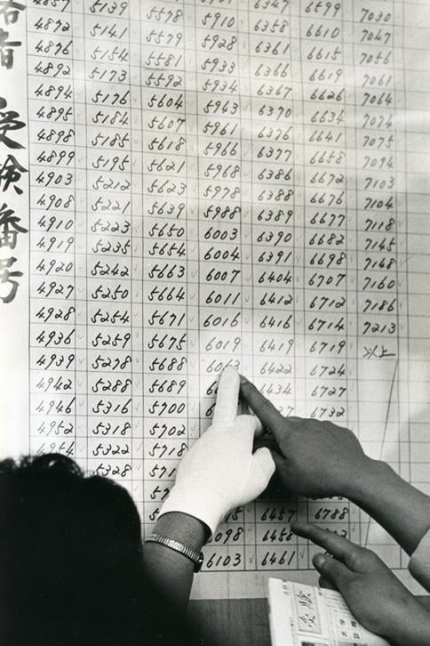 中央の(一番上の)写真は試験当日の日吉の風景である。新聞会など塾生の団体が模範解答を販売している。予備校と連携して、試験終了時に間に合わせての販売だった。確か1970年代後半まであったようだ。また、合格発表の速報も彼らによって構内で販売されていた。慶應仲通り等の洋服店にも合格者速報が貼り出されていて、そこでいち早く知ることもできた。学生服を新調する新入生は今よりはるかに多かったはずだ。新入生は自分の受験番号が貼り出された店で学生服を新調することは鼻高々だったことだろう。店主もまたその点を心得ていたのかも知れない。朝、合格発表があると番号表は案外ルーズに扱われていたようで、今思えば信じられない古き良き時代である。古き良き時代といえば、1967(昭和42)年頃の合格発表掲示は手書きだった。すべての学部のすべての合格者番号は膨大な量になるが、受験番号が大変見やすく同じ調子で書かれている。71年をもって手書きは終了となった。筆者が入試業務を担当していたのは70年代終盤から80年代にかけてであったが、この職人技を自慢げに話す先輩達がまだまだいた。その後10年ほどはタイプライターで作成したものを近所の写真店で大きく拡大して使用していた。