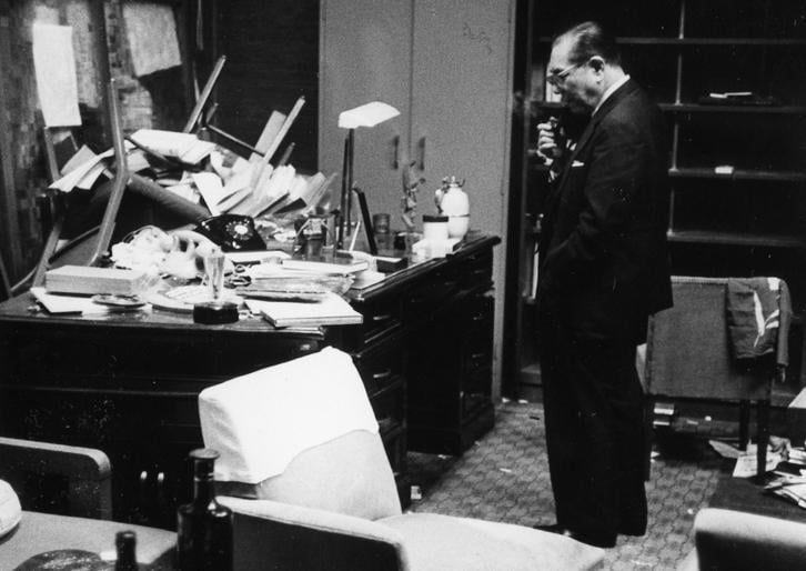 1968(昭和43)年6月3日の新聞報道から沸き起こった米軍資金紛争は、複数回の常任理事、塾長会見後、過激派の塾監局占拠に及んだが、塾生の手により占拠解除となった。