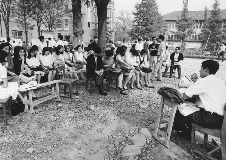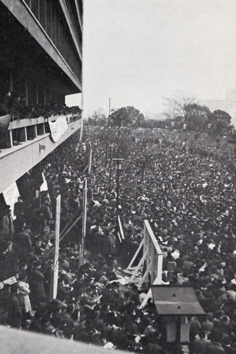 画像:1968(昭和43)年、スト終結へ展開するきっかけとなった10月18日の全塾学生大会(三田・南校舎前)、11月2日、日吉でも塾生大会が開かれた。