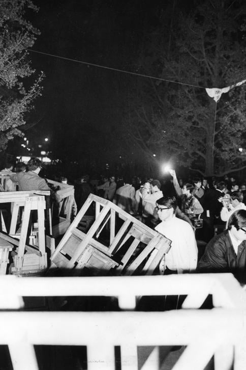 1969(昭和44)年5月の日吉学生大会から始まった大学立法紛争は、6月末、日吉がまたバリケード封鎖され、8月には日吉全建物、三田南校舎、研究室等が占拠された。9月11日、日吉ラグビー場の全学集会に集まった1万人を超す学生に佐藤朔塾長が所信表明。その後10月13日、機動隊待機のもと、教職員により日吉のバリケードが撤去された。