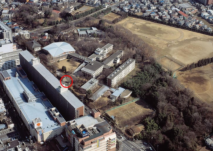 写真右上に見える塾宅群の一番奥の右側が私の生家です(現志木高体育館付近)。その家は慶應義塾農業高等学校創設に携わり、後の志木高校でも教鞭をとっていた父(故大舘清次)に貸与されていた塾宅でした。この写真は私が生まれる以前、1951(昭和26)年の空撮写真です。東邦産業研究所から譲り受けた施設だったため、工場作業場跡や変電室を上手く利用した校内であり、正面の三角屋根の立派な本館(現志木大陸橋下コンビニエンスストア付近)が特徴的でした。グラウンド左の戸建ての建物も1つ1つがホームルームに割り当てられています。