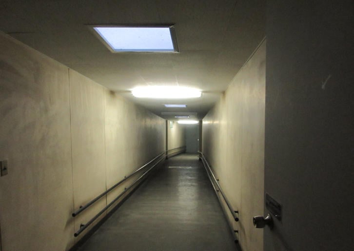 そこで新研究室棟建設計画になかった図書館第三書庫2階(建物構造上は3階)と研究室棟3階を連結する「渡り廊下」工事が、施設部の苦肉の策として追加された。その廊下は、全長約14米(メートル)、幅1.8米で外側からは平行で直線にみえるが、研究室側からやや右ドッグレッグで、しかも斜度が付いていた。そのような形状であったため、図書館側へは前屈み、逆方向には反っくりかえり気味に移動せざるを得なかった。おそらく強度の確保のためだろうか、窓1つ取り付けられていなかったので、陰鬱な雰囲気をただよわせていた。図書館業務上、資料を大量にブックトラックに積み込み両施設を移動するのは不可欠だが、その都度いささかスリリングな作業が日常的に繰り返されていた。