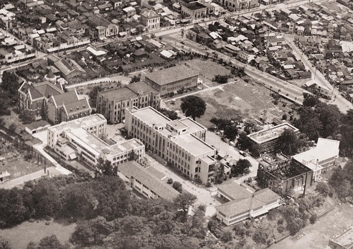 画像:昭和42(1967)年撮影。第三校舎が壊され、新研究室の西側部分が立ち上がっている。第一校舎の屋上には1965年1月に造られた第五研究室がみえる。