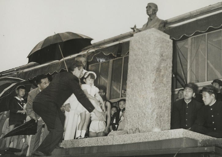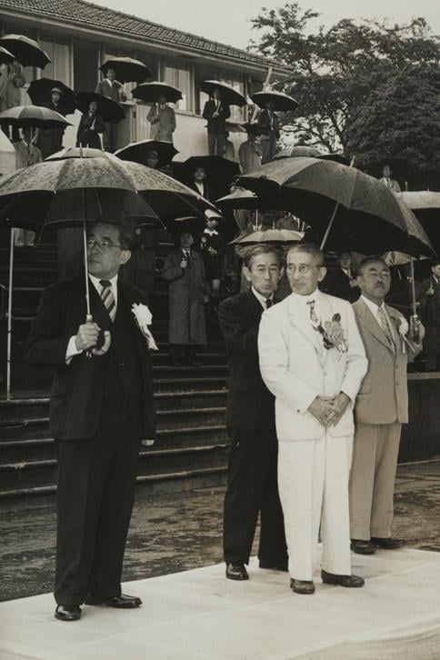 画像:1955年5月29日の胸像除幕式、雨中の日吉競技場を行進する体育会学生。