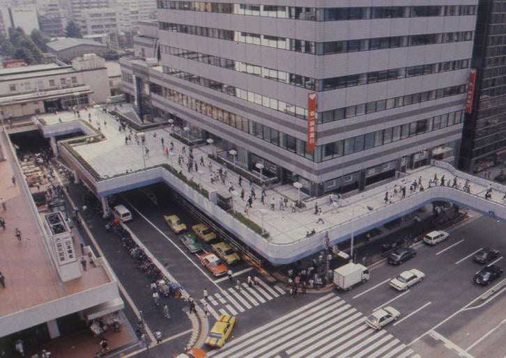 (当初は、跨線橋で芝浦口改札にもつながっていたが、東西を行き来する自由通路は無かった。改札が2階に上がって統合され、自由通路ができたのは1971年2月。1994年10月には三田側の国道15号をまたぐデッキができて人の流れが大きく変わった。2003年2月、東西自由通路の幅は広がり、現在に至る。)
