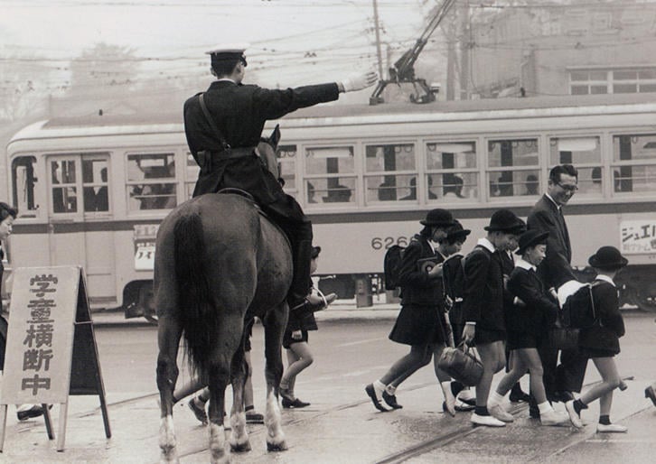 幼稚舎の前には、天現寺の停留所がありましたが、それだけではなく幼稚舎のはす向かいに都電の広尾車庫がありました。天現寺には、7番、8番中目黒~築地、34番渋谷駅前~金杉橋が走っていました。天現寺の交差点には、柱の上に箱を載せたような建物がありました。操車塔と呼ばれたポイント切り替え所です。天現寺交差点は、T字に都電が走っていたので、この塔の上から係員が肉眼で確認してポイントを切り替えていたのです。安全地帯も変わった形のものがありました。通常は棒状ですが、幼稚舎前の安全地帯が直角三角形のような形をした広いものでしたから、幼稚舎生が大勢待っていることができました。