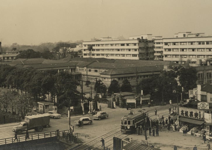 画像:1956年の幼稚舎と天現寺橋交差点。ロータリーには都電が走り、ロータリー右手には操車塔が、上側には車庫がある。KEIOの人文字がまぶしい。