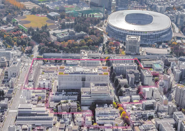 55年後の2021年の写真でも、街の基本構造は大きくは変わっていないが、「東京2020オリンピック・パラリンピック」の主会場となった新国立競技場が目立つ。また、医学部・病院以外に大きな建物がなかった時代に比して、周囲に同程度の高さの建物が多く見られる。