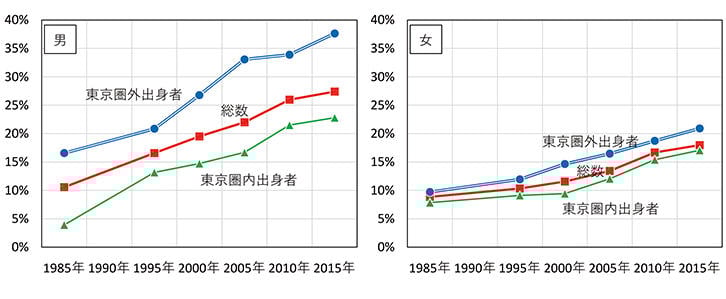 ここで私が考えたのは、東京区部に居住するミドル期人口のうち、東京圏内出身者よりも東京圏外出身者の方が、シングル率が高いという関係であり、人口移動がシングル化を促進するという仮説です。というのも人口移動経験と家族形成行動との関係には国際的にさまざまな研究蓄積があり、日本でも大都市圏への移動経験者の出生率が低かったり、生涯未婚率が高かったりすることが明らかにされています。それと同じ枠組みをミドル期のシングル化にも適応できるのではないかと考えたのです。