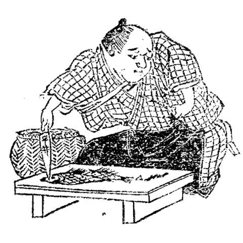 人差し指を包丁で切り落としてしまった板前が、恨めしそうに傷口を凝視している。目の前のまな板には、ちぎれた指の先端が転がっている──この奇抜な図柄こそが、明治18年に、我が国で最初に商標登録された記念すべきロゴマークである(図1)。