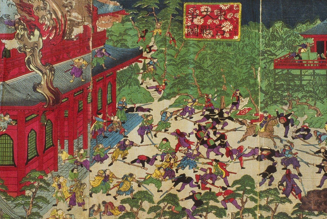 その年の4月、福澤は築地鉄砲州にあった塾舎を芝新銭座(現在の港区浜松町一丁目)へ移し、時の年号をとって「慶應義塾」と命名した。また、教育宣言「慶応義塾之記」を発表し、私塾としての福澤塾から近代的な学塾へと変貌をとげ、新たな出発を迎えた塾には活気がみなぎっていた。一方、当時の世の中は、幕藩体制から王政維新への大転換期だった。官軍と幕府の間で行われていた江戸開城の交渉は合意に達したものの、これを不満とする一部の幕臣たちが「彰義隊」を結成して上野の山に立てこもったため、官軍が攻撃を開始した。それが5月15日だった。『福翁自伝』によれば、「上野に大戦争が始まって、その前後は江戸市中の芝居も寄席も見世物も料理茶屋もみな休んでしまって、八百八町は真の闇、何が何やらわからないほどの混乱」で、新銭座の塾舎にも上野の砲声が聞こえてきた。