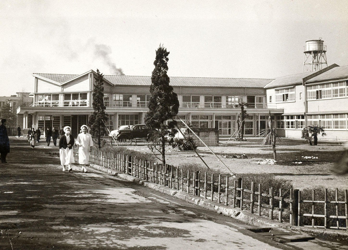 新学制が施行された22年の7月、幼稚舎構内に普通部用の木造校舎が竣工したのを皮切りに校舎の復興が進み、同年9月には戦後量大の木造建築といわれた信濃町の医学部病院本館が完成した。24年、日吉が返還され、残存校舎や進駐軍が残したカマボコ兵舎を利用しながらではあったものの、義塾の諸施設は一応の復興を遂げることとなった。