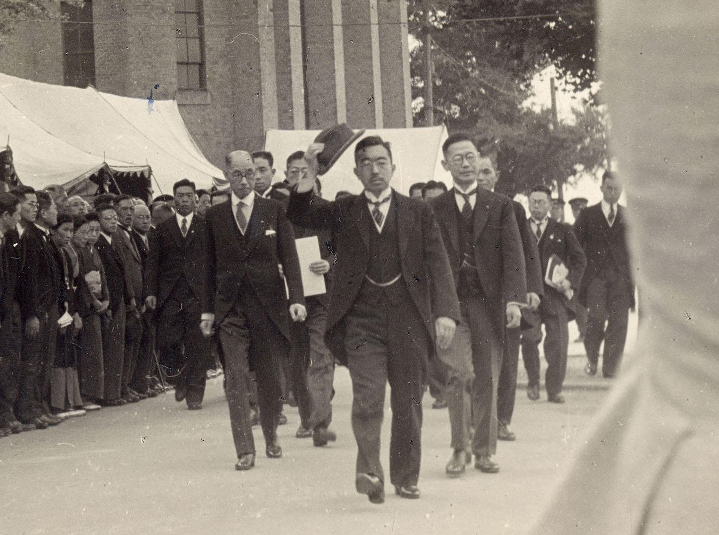 終戦から2年後の昭和22年、義塾は創立90周年を迎え、廃墟となった三田山上で記念式典を挙行した。構内には会場となる建物もなく、焼け跡の広場に設けられたテント張りの式壇に、私学として初めて天皇陛下をお迎えし、「福澤諭吉創業の精神を心として、日本再建の為、一層努力することを望む」とのお言葉を賜った。