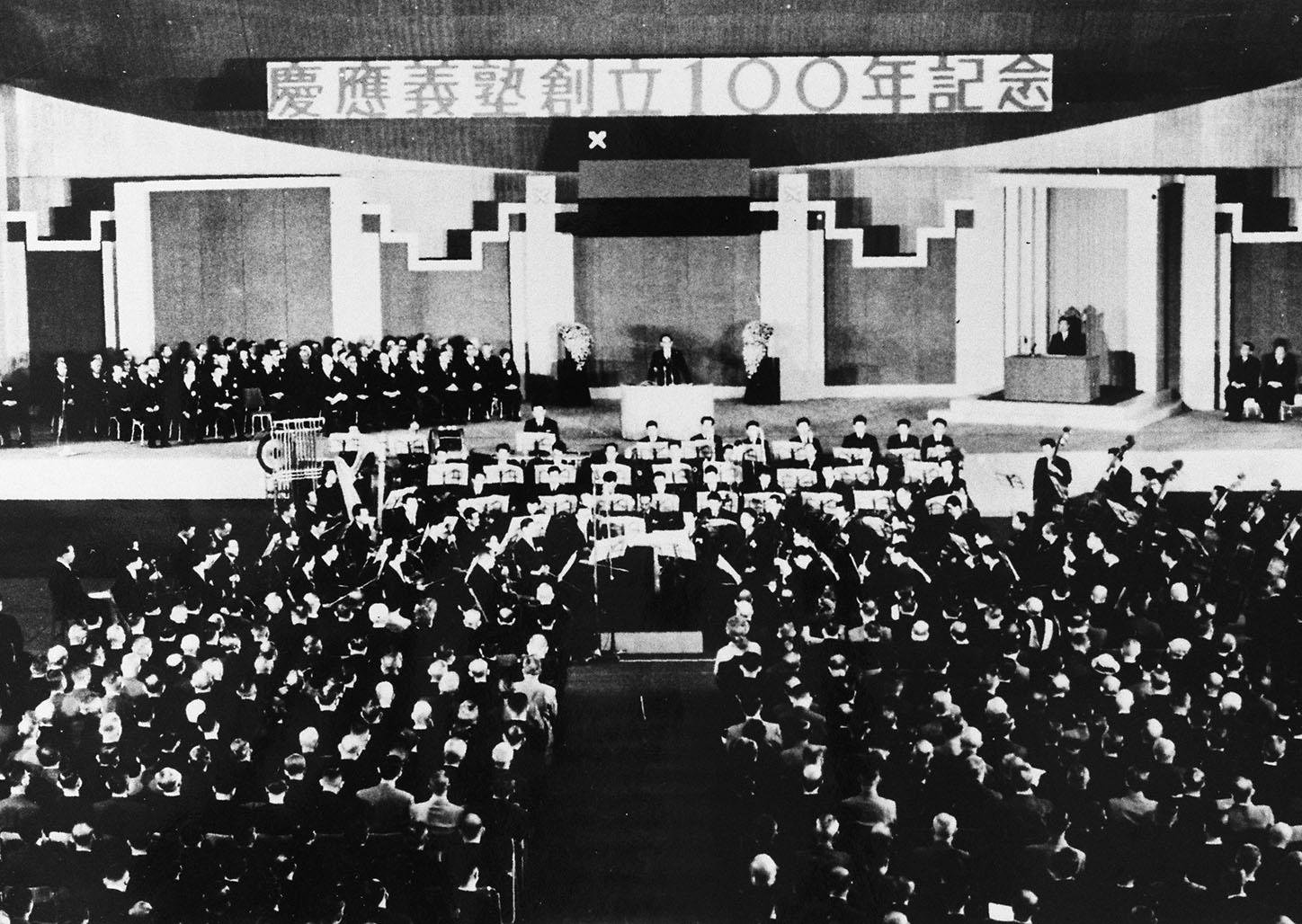 その後、創立100年祭へ向けて義塾内外の気運が高まりを見せ、諸事業が進展していった。昭和33年11月8日、新装成った日吉記念館に再び天皇陛下をお迎えして、また、早大および東大総長、ハーバード大代表、塾員代表小泉信三らの出席者を迎えて、創立100年記念式典が盛大に挙行された。陛下からは、義塾が「更に協力一致して此の輝かしい伝統を守り、我が国文運の進展に寄与するよう努力せよ」とのお言葉を賜った。