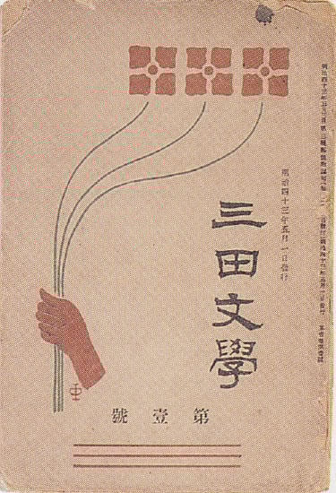 このように、『三田文学』は文学科刷新の動きの中で、明治43年5月1日に発刊された。創刊号には、森鷗外、野口米次郎、木下杢太郎、三木露風、馬場孤蝶、山崎紫紅、永井荷風、黒田湖山、深川夜烏らの作品が並び、藤島武二の斬新なデザインが表紙を飾った (「田」の字形に図案化した四つ葉のクローバーを3つ描いて「三田」を表した)。また、裏表紙には福澤諭吉自筆の「修身要領」第21条「文芸の嗜は人の品性を高くし精神を娯ましめ…」が掲げられていた。