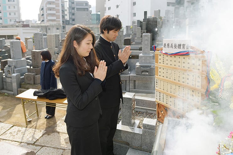 本文で紹介しているように、来る2月3日(土)は本塾の創立者・福澤諭吉先生のご命日「雪池忌」です。毎年この日には、幼稚舎から大学院までの塾生をはじめとする多数の義塾社中が麻布山善福寺の墓前 に参り、早朝から参詣者の列が絶え間なく続きます。これは塾生たちの間に「福澤先生の命日にお参りをすると落第しない」という噂が言い伝えられていることにもよりますが、先生が亡くなってからすでに100年近い年月が経過しているにもかかわらず今日なお多くの塾生が自らの意思で創立者の墓前に参詣するのは、慶應義塾ならではのすばらしいならわしの一つといえるでしょう。