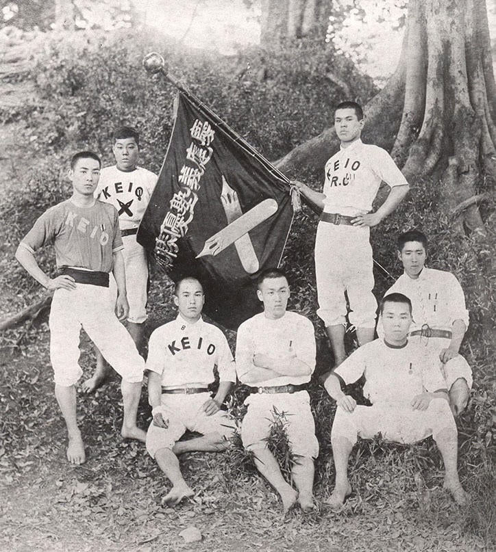 このように三色旗はいつの間にか浅黄と紅を取り合わせたものとして起こり、明治30年前後から使われだしたらしい。しかし、色彩も形も色も規格まちまちであったことから、昭和39年2月14日付で「塾旗の基準について」として、塾旗の寸法と色・ペンの型・三色旗の割合とペンの位置が明確に定められ、今日に至っている。