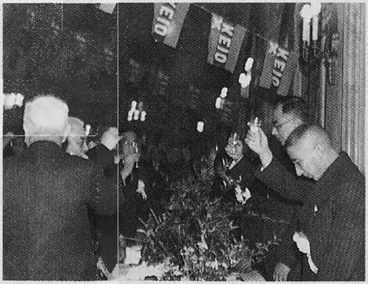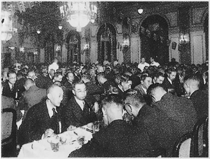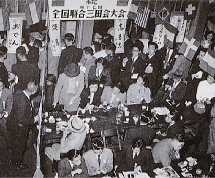 昭和5(1930)年には、各地で結成された三田会の総数は100団体を数えるほどになっていた。前述の同窓会も全国に散らばる塾員全員の参加が不可能となっており、各地三田会と義塾との連絡を密にし、かつ相互の意志疎通を図る組織が望まれるようになっていた。同年、さっそく塾員有志によって「連合三田会」結成が協議され、11月に東京・丸の内東京會舘で「第1回連合三田会大会」を開催。以来、東京會舘、帝国ホテル等を会場として、毎回、数百人の参加者を集めるなど隆盛を誇っていた。しかし、戦局の悪化により昭和19(1944)年にやむなく中断。戦後、昭和26(1951)年三田山上にて「連合三田会」が復活した。