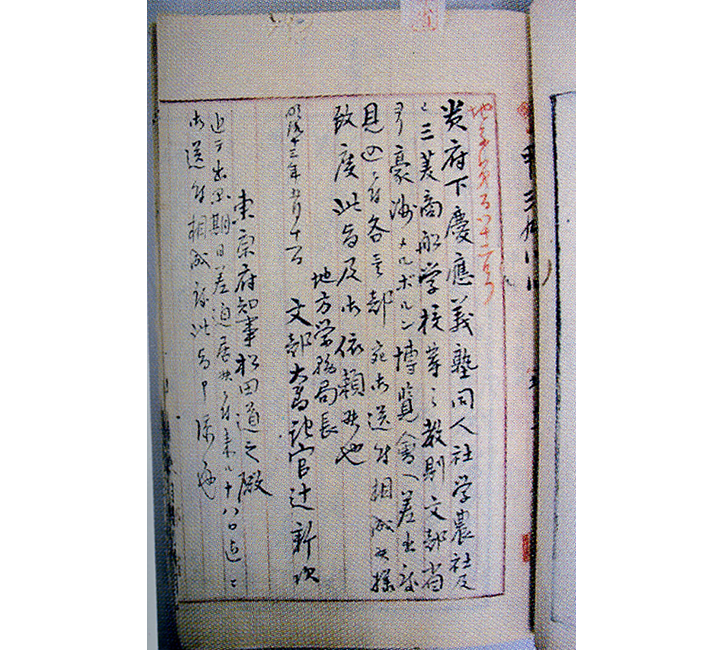 「学業勤惰表」は、1冊ずつ全塾生に配布され、所定の代金を払えば何部でも購入することができた。つまり、当時は学業成績を広く公表していたのである。現在、慶應義塾大学では、原則として保証人に成績を通知しているが、学業成績の公表は慶應義塾に限らず明治時代には珍しいことではなかった。この時代の学校案内の中には在学生の成績表が付録となっているものまである。そして明治13年、慶應義塾は当時の文部省から「慶應義塾社中之約束」および「慶應義塾勤惰表」をオーストラリア・メルボルンで開催される博覧会に出品するように要請を受けている。(写真<2><3><4>)これらの資料が実際に展示されたかどうかは定かではないが、わが国の教育を代表する資料として、国外での公開まで考えられていたことは確かである。当時の学業成績は、今日のように必ずしも個人情報ではなく、パブリックな情報と認識されていたのかもしれない。また、明治期の慶應義塾は、その名の通り私塾としての性格が色濃く、同じ寄宿舎で寝食を共にする仲間同士、お互いの成績や席順に関しても、極めてオープンな気風が満ちあふれていたのだろう。「学業勤惰表」の最古の物である明治4年4月発行分には、旧所蔵者によると思われる多くの朱書きが入っており、ここから類推すると、第一等から第四等までの上級生が、第五等以下の下級生を教えていたことが分かる。これは慶應義塾の「半学半教」の実例として貴重な記録と言えるだろう。