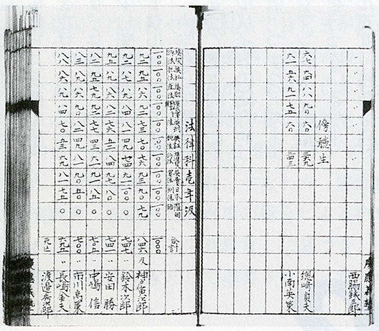 『慶應義塾百年史』によると法律科入学者は9名であったが、そのうち卒業できたのはたった5名。理財科、文学科も卒業できた者は同程度であり、病気や経済的理由で学業を断念したケースもあったが、入学者2人に1人の割合でしか卒業することがきなかった。なお、写真の「学生勤惰表」で成績トップの神戸寅次郎は、後に法学部長を務めた人物である。