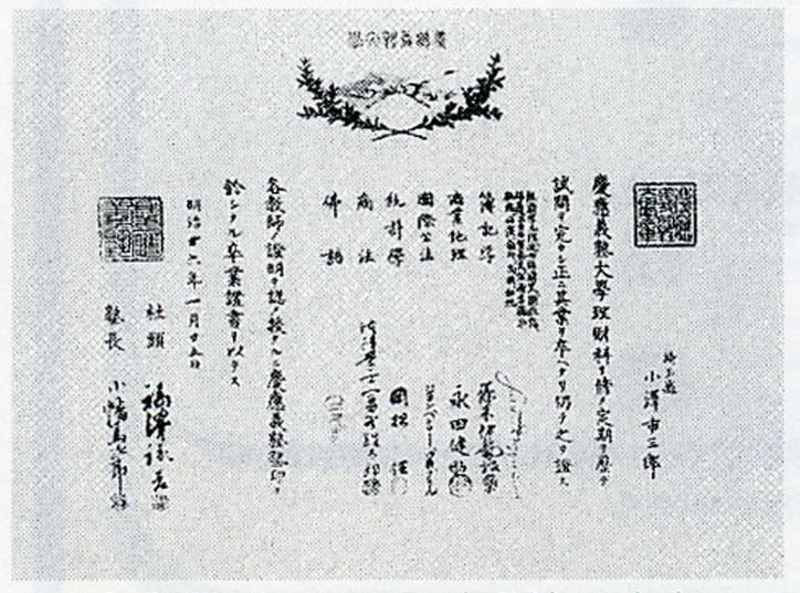 明治20年代の大学設立記念章や卒業証書などを見ると、羽ペンと剣がリボンで結ばれた、現行のものとはずいぶん異なる図柄が使用されている。限られた資料よりわかっているのは、ペンマークは慶應義塾として公式に制定したものではなく、塾生有志のアイディアから生まれ、それが歳月を経て、公認されるようになったものらしいということだ。そして、その誕生のきっかけは「和服」から「洋服」への転換にあった……当時の塾生であった藤田一松君、高田源次郎君の懐旧談によれば、その経緯はおおむね次の通りである。