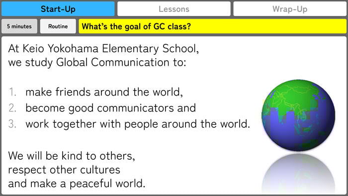 「GC英語」という名前にした最大の理由は、横浜初等部に通う生徒たちが、将来、10年後、20年後、30年後に日本と世界のために何を一番しなければいけないかと考えた時、それは「グローバル・コミュニケーション」だと思ったからです。つまり「世界の人と伝え合う力の基礎」を身に付けるということを強調したかったのです。ただ勉強として英語ができるというのではなく、効果的に他の国、文化の人と協力ができる人になる基礎づくりを小学校の時に目指したいと思い、提案しました。