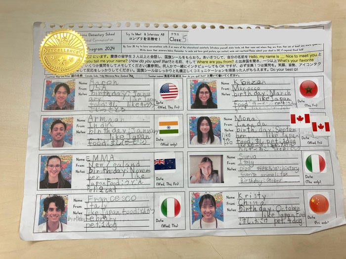 高学年は「インタビューラリー」をします。留学生の写真が印刷してある紙を配布して、その人を見つけてインタビューをすると、その人の国の国旗のシールがもらえて、貼るんです。八カ国のシールが揃うと、コンプリートメダルがもらえるというようなことをやっています。
