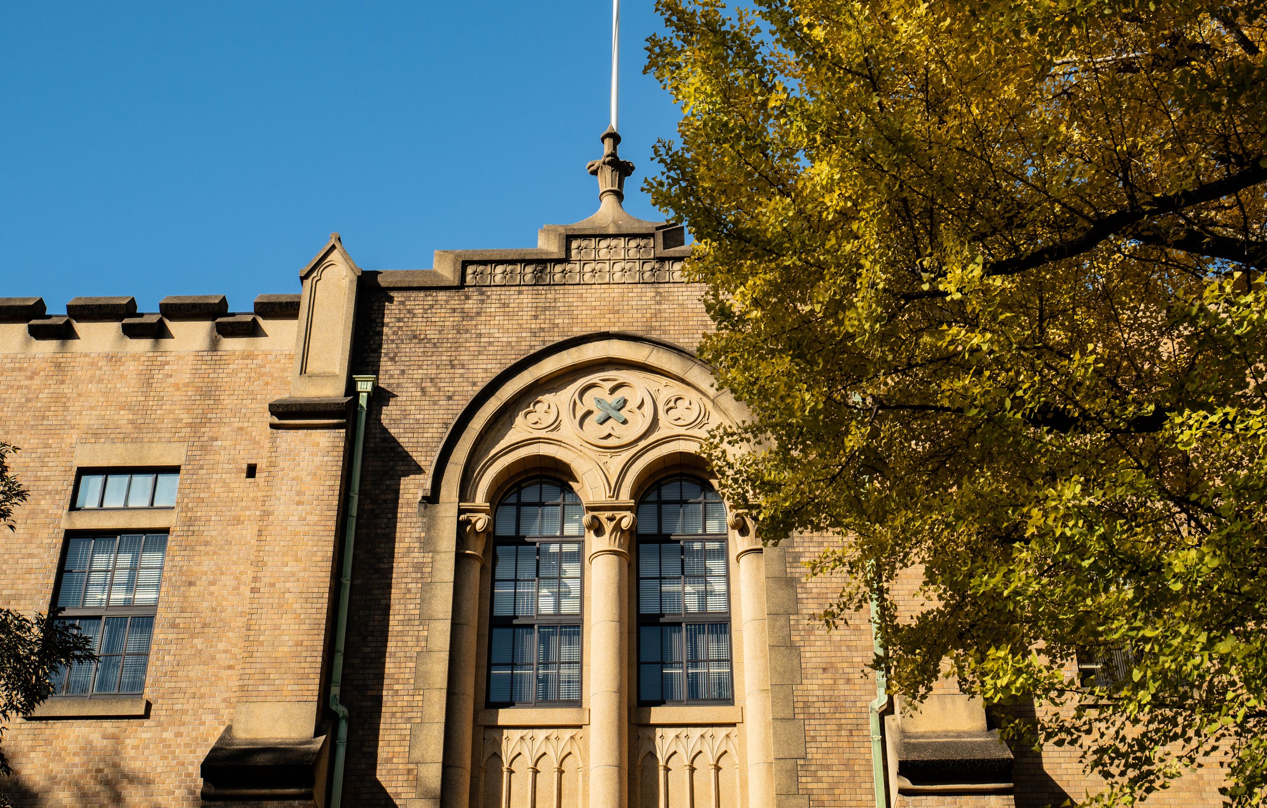 慶應義塾大学三田キャンパスにそびえる歴史ある建物、ペンマークが刻まれた塾監局