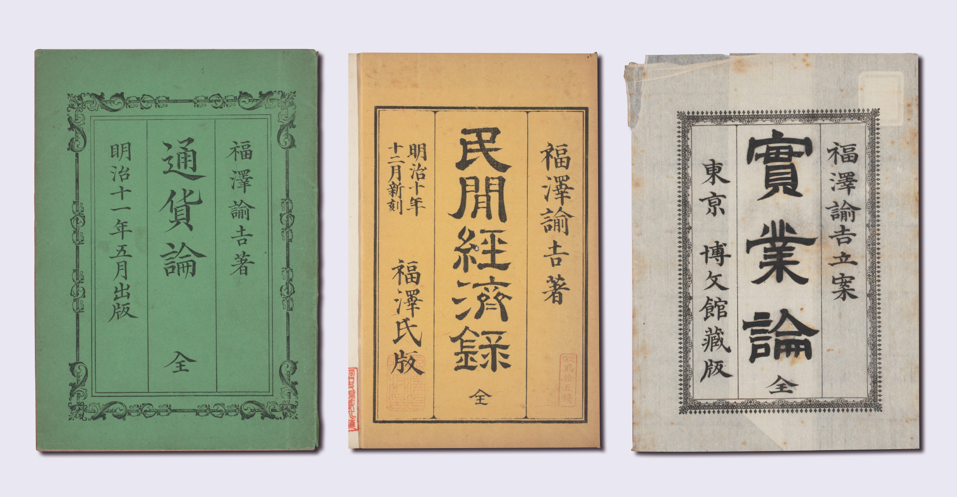 3冊の福沢諭吉著作の古書。左から、「通貨論」、「民間経済録」、「実業論」