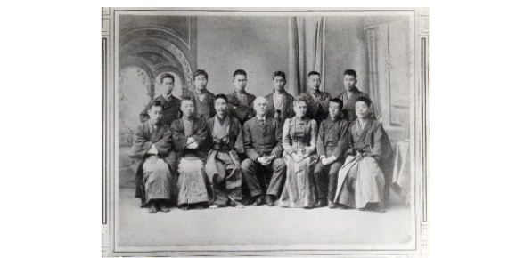 1892(明治25)年の大学部文学科第一回の卒業生の写真です。真ん中に文学科主任のW.S.リスカムと同夫人がいます。初代文学部長となった川合貞一は前列左から2番目の人物です。