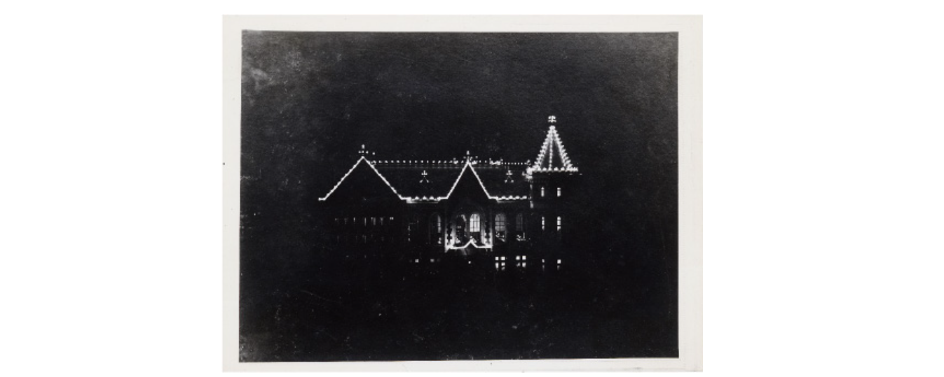 創立50周年記念事業として図書館を新設。ネオ・ゴシック様式の建築は、曽袮達蔵・中条精一郎の設計によるもの。慶應義塾の象徴として今も愛され続けています。この写真は開館式当日の夜のイルミネーションの様子です。