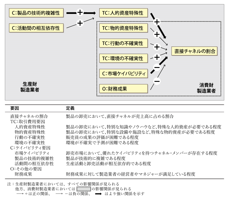 その他、ケイパビリティ要因について、市場ケイパビリティが高くなれば、直接チャネルの割合が低くなることが、生産財でも消費財でも一貫して強く確認された。また、生産財では、製品の技術的複雑性が人的資産特殊性を強く規定していた。