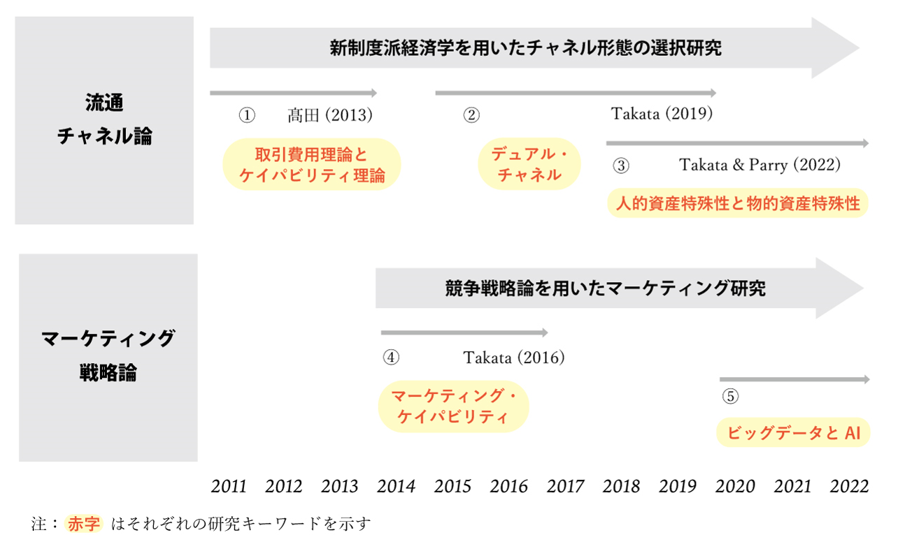 私が所属する商業学・マーケティング分野は、消費者行動論、製品開発論、価格論、広告論、流通チャネル論、マーケティング戦略論など、様々な各論から構成される。これらの中で、私の専門は、流通チャネル論とマーケティング戦略論である。2011年に慶應義塾大学商学部専任講師に着任して以来、この2つの分野において行ってきた研究の発展プロセスを整理すると、図表1のようになる。以下、この図表に基づいて研究紹介をしていく。