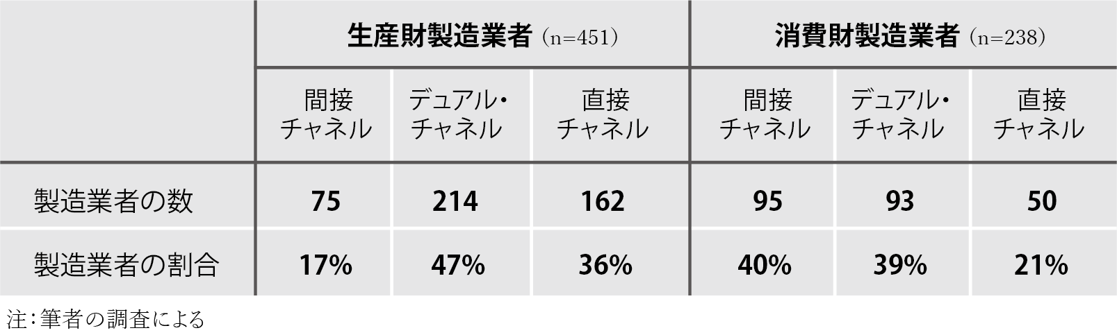 ある製品の流通において、売上高の90%以上を直接チャネルか間接チャネルが占めればそのどちらかが用いられているとし、それ以外はデュアル・チャネルが用いられているとする。このルールの下で、日本の製造業者によるチャネル形態の選択状況(卸段階)を示すと、図表2のようになる。この図表から、生産財では消費財と比べて直接チャネルを主軸に据える製造業者の割合が高く、消費財では生産財と比べて間接チャネルがメインの製造業者の割合が高いことがわかる。