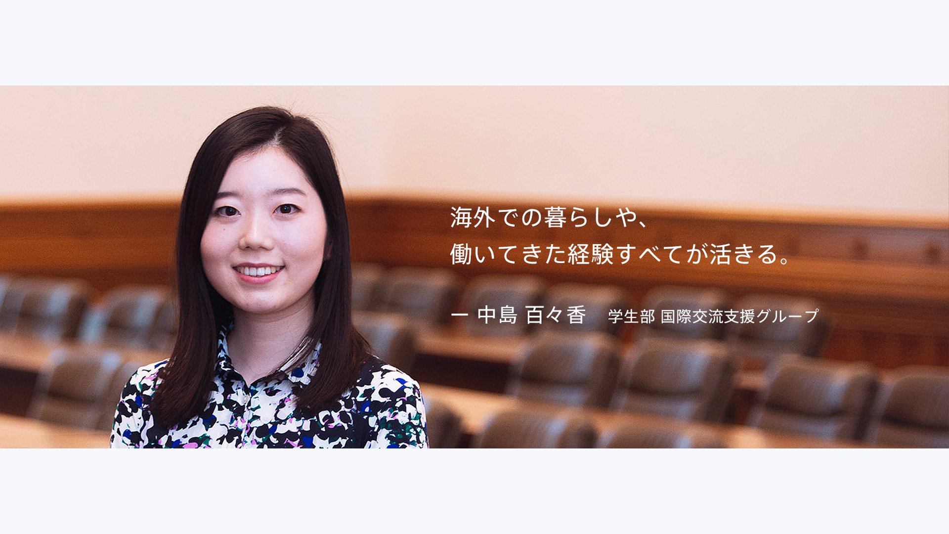 大学職員というと、事務の仕事が中心で、1日中パソコンに向かいデスクワークがほとんどだと思っていました。しかし、それはいい意味で裏切られました。実際には、何かトラブルが起これば現場に急行し緊急対処しなければならなかったり、さまざまな研修に行く機会も多かったりで、デスクに向かって仕事をするという時間は少ないですね。私の業務は、毎回決められたルールの中でこなさなければいけない奨学金と、毎回同じケースは発生しない学生生活をサポートする、この相反する性質の業務を同時に行っていくことこそ、この仕事のやりがいでもあり、最も難しいと感じるところでもあります。もともと私は、歴史学が好きだったので、起こったことを自分の中で読み解き、物事を違った方面から考えていくということを習慣的にやっていたので、その発想が今の仕事に役立っています。