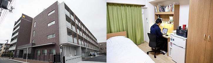 日吉国際学生寮(2017年に開設された、ユニット形式(4つの個室と共有部を、日本人学生2人、留学生2人で使用)の国際学生寮。共用キッチンや集会室など交流スペースも豊富)