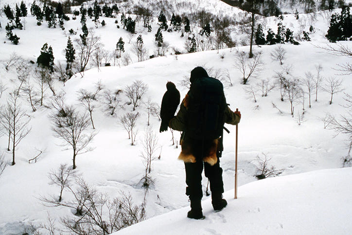 松原:私が師匠の沓沢朝治(くつざわあさじ)氏に弟子入りしたのは文学部卒業後の1974年です。当時、師匠は79歳で、もう獲物を追って雪山を歩き回る狩りはしていませんでした。師匠が若く現役の頃は、冬の雪山には小動物も多く、また毛皮がいい値段で売れたので、冬の仕事として成り立っていました。しかしその後、徐々に動物は減り、また毛皮が売れる時代ではなくなり、さらに野生動物保護の関係でクマタカを手に入れることも難しくなって、仕事としての鷹匠は、生活的に難しい状況です。実は私が師匠に弟子入りした頃には、こうなることは予想できていました。それでも鷹匠を一生の仕事と決めて、今まで貫いてきました。