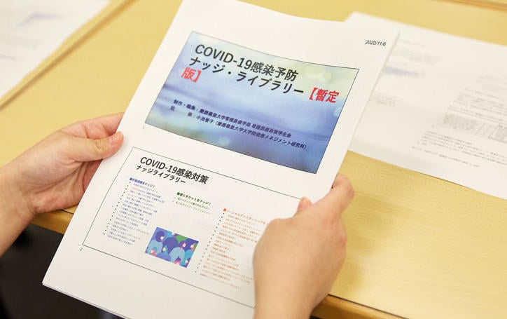 一定の距離を保つ立ち位置を示した床のテープ、消毒液の設置場所を強調する矢印。昨今、街中で見かけることの多いこれらの仕掛けは、望ましい選択を自発的に促す行動経済学の「ナッジ」理論をCOVID-19対策に活用したもの。中村君が率いる看護医療政策学生会の2年生はいま、特に若者に響くナッジの研究に取り組んでいる。まず、全国の大学生約500人の意識調査から、何が・なぜできないのかを分析。消毒液を適正量使う工夫を施したノズルや、スマホケースと組み合わせた除菌シートなどの提案を目指す。「今後も、社会的影響力のある研究をしていきたい。認知症の方が快適に過ごせる施設の在り方や、障害のある子と健常児が共に教育を受けることによる効果にも関心があります」