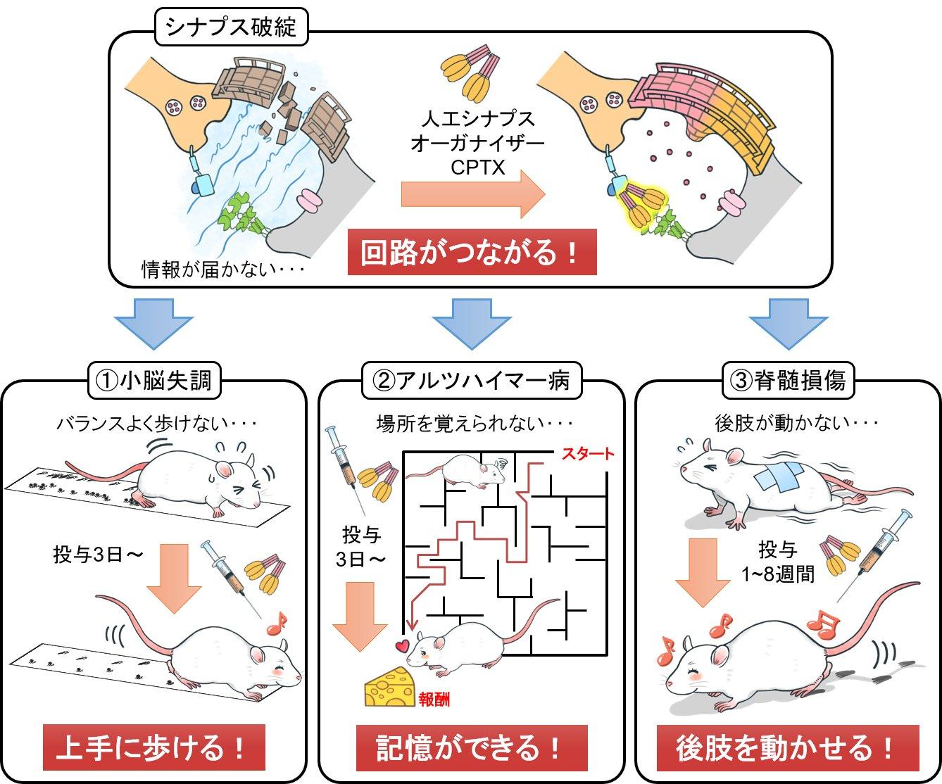 慶應義塾大学医学部生理学教室の柚﨑通介教授らの研究チームは、神経細胞同士のつなぎ目である「シナプス」で実際に神経細胞と神経細胞とを結び付ける物質「シナプスオーガナイザー」を世界で初めて人工的に作り出すことに成功、その研究成果を科学雑誌『Science』に発表しました。「CPTX」と名付けられたこのタンパク質を動物に投与すると、脳や脊髄でシナプスが作られます。その結果、脊髄の損傷で麻痺していたマウスの後ろ足が元通りに動くことを強力に促進し、アルツハイマー病で餌の場所を覚えられなかったマウスの記憶能力が改善するようになったのです。研究は、今後ヒトへの応用が期待されています。