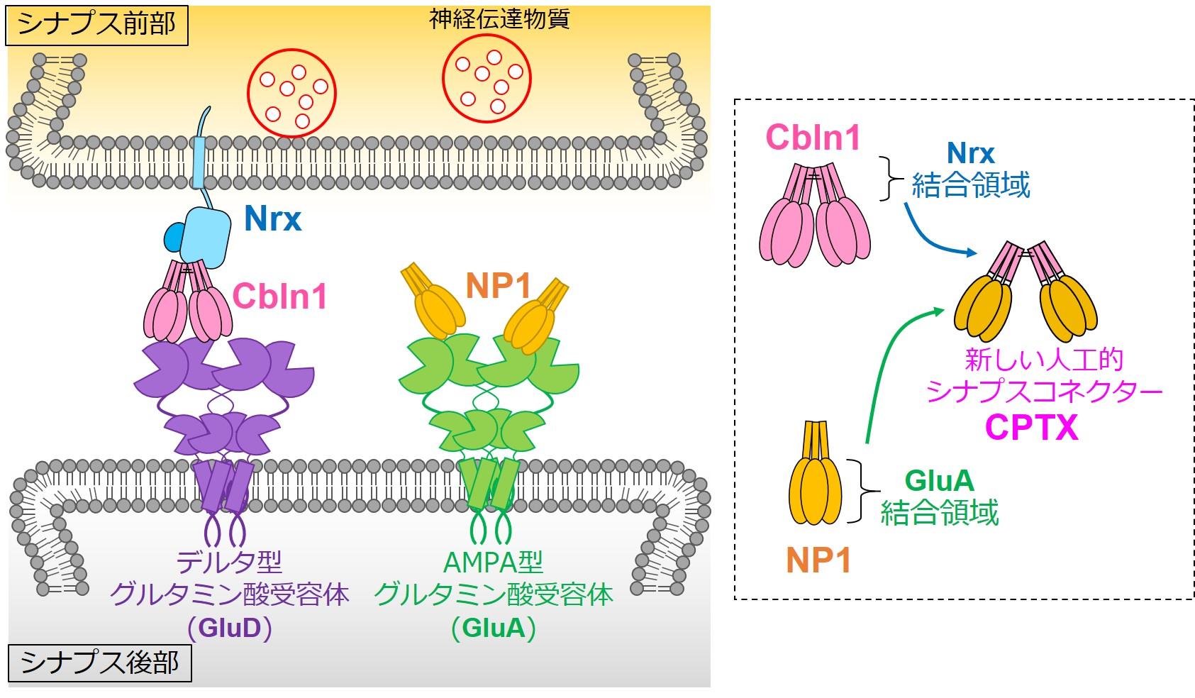 「そこで、Cbln1とNP1を半分に切り、Cbln1がシナプス前部のNrxと結合する部分と、NP1がシナプス後部のGluAと結合する部分を人工的に組み合わせてやれば、全ての脳脊髄で働くシナプスコネクターができるのではないかと考えました(図1右)。こうして作り出した人工シナプスコネクターをCPTXと名付けました。」