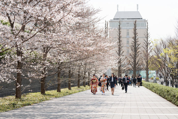 式には外国人留学生も多く参列し、幅広い年代の修了者がその家族とともに日吉キャンパスに集いました。式典後、修了者は研究科ごとの会場で学位記を受け取り、見ごろを迎えた満開の桜のもと記念撮影をするなど、それぞれの新たな門出を祝いました。