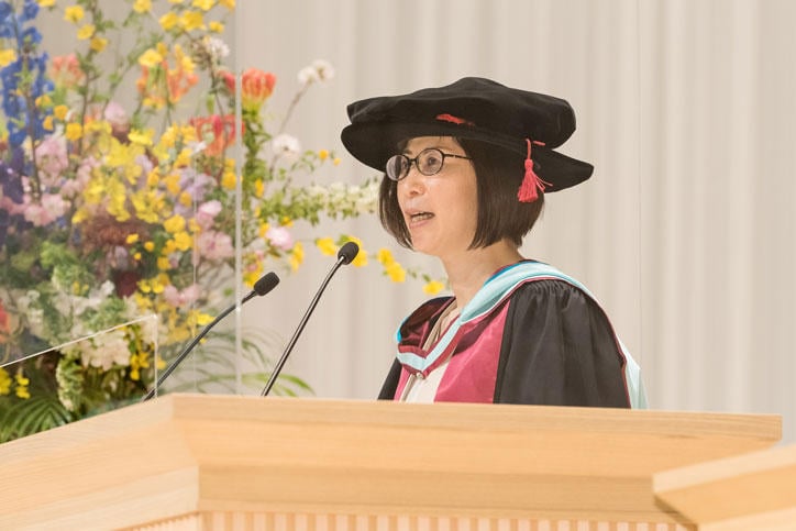 式は青山藤詞郎常任理事による学事報告に始まり、続いて長谷山彰塾長により式辞が述べられました。塾長は、大学院でそれぞれの専門分野について深く学ぶと共に、学んだ知識を総合して、社会的な課題や地球規模の課題にも対処できる創造的な「知」を育むことを意識して欲しいと語りました。続いて山尾佐智子経営管理研究科究科准教授による教職員代表祝辞があり、最後に塾歌の音源再生が行われ、式典は終了しました。